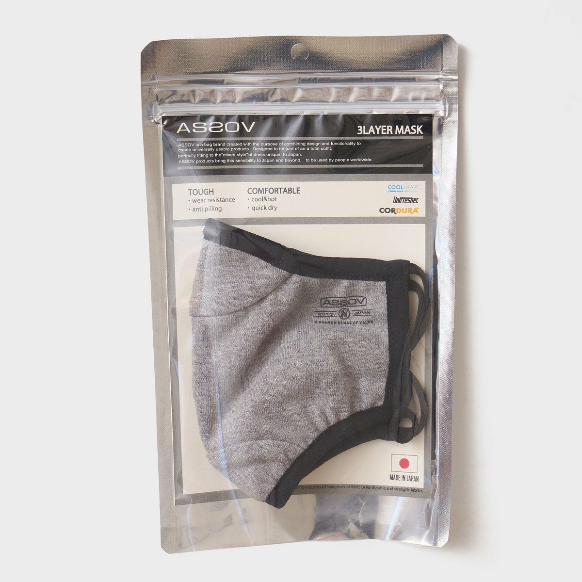 AS2OVらしく機能的なコーデュラ素材を表面に採用しています。柔らかな質感は肌触りがよく日常使いに最適です。また三層構造の中の中間層には抗菌素材を使用しているので、通常の不織布マスクなどにくらべて、雑菌の繁殖や嫌なにおいを防ぐ効果があります。