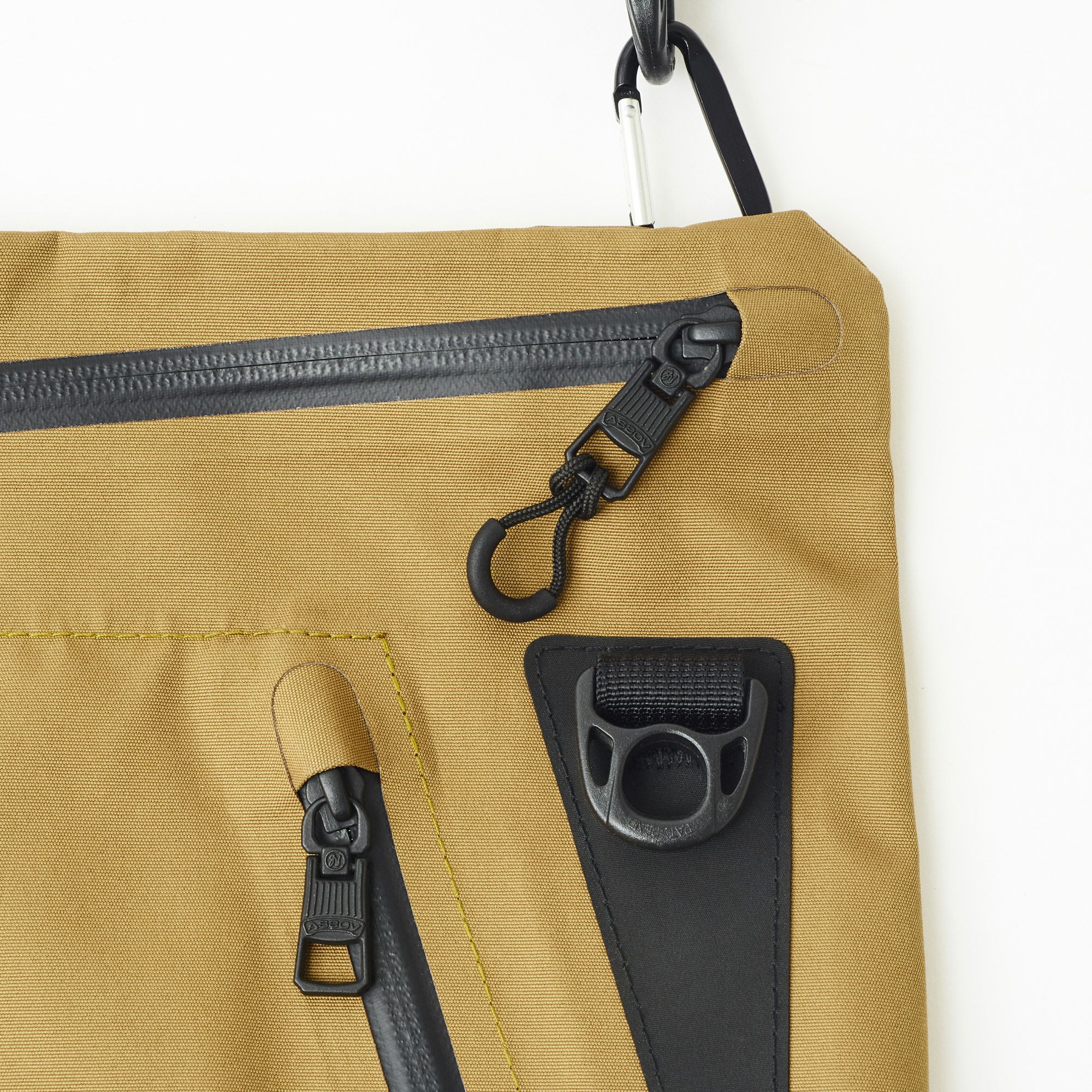 ファスナーには全て止水ジッパーを採用し、ファスナー部からの浸水も防ぐ構造になっています。ショルダーバーツはAS2OVオリジナルカラビナで取り外し可能で、外してポーチなどとしても使えます。