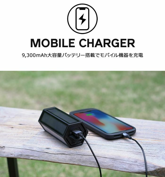 六角形の特徴を最大限発揮できるよう設計・デザインされた、ROOTCO.オリジナルのソーラー充電対応バッテリー機能付きLEDランタン『HEX-SoLa(へクス-ソラ)』。 3枚のソーラーパネルと3枚のLEDパネルを上下に、側面にはハンドライト用LED、各種USB入出力ポートと操作ボタン、吊り下げ用金具をそれぞれ配置しました。 吊るす・置く・引っ掛ける等の使い方ができ、各種アウトドアシーンに合わせて使用できるよう防塵防水機能も兼ね備えた、多機能LEDランタンです。 【LEDLANTERN】 120個のLEDチップを搭載し、最大1500LM(ルーメン)の明るさで出力が可能。 シーンに合わせて最適な明るさで照らせるよう、5段階の照度(明るさ)調整機能、3種類の色温度(カラー)切替機能を備えました。 照度:15・100・500・1000・1500(LM) 色温度:暖色・白色・混合色 【HANDYLIGHT】 照度(明るさ)200LMのハンドライト(懐中電灯)機能も搭載。 暗闇での移動や、スポットで灯りを照らしたいシーンでもご利用可能です。 ※ランタンとハンドライトを同時に点灯することはできません。 【SOLARCHARGE&USBCHARGE】 太陽光をソーラーパネルに当てることでHEX-SoLaへの充電が可能。 夏場の晴天時、約6時間のソーラー充電で最長約10時間点灯可能(最小照度点灯時)になります。 USB充電の場合は約7~8時間で満充電となります。 ※USB充電中は各機能(ランタン、ハンドライト、ソーラー充電、USB出力)は使用できません。 【MOBILECHARGER】 9300mAhの大容量で、HEX-SoLaから他のモバイル機器への充電が可能。 ※最大出力:5V/2A(充電する機器により異なります。) 【DUSTPROOF&WATERPROOF】 IP65の保護等級に準拠した防塵防水性能。 水没させない限りあらゆる場面において水の侵入を防ぎ、埃の侵入を防ぎます。 水辺でのアウトドアシーンはもちろん、急な雨などでも安心して使えます。 ※USBポート部分のキャップが閉まっている状態での保護等級です。キャップを閉めてご使用下さい。 【MULTIPOUCH】 伸縮性のある生地を使用した専用収納ポーチを付属。 HEX-SoLaの収納だけでなく、吊り下げ用金具に通しS字カラビナで固定することで、ランタンを下向きに照らす際に使用可能です。 ハンドライト使用時には、腕に通す落下防止用リストバンドとしても使うことができる、マルチポーチとなっています。 カラー:ブラック/グレー メーカー型番:PHSL-431623/PHSL-431630 付属品:マルチ収納ポーチ・カラビナ・USB-microUSBケーブル・取扱説明書 バッテリー容量:3.7V/9300mAh 入力:DC5V/2A 出力:5V/2A 本体充電時間:USB充電約7~8時間 保護等級:IP65 ランタン連続点灯可能時間:(ご使用時の環境により差が生じる場合がございます。) ・15LM:約416時間 ・100LM:約276時間 ・500LM:約85時間 ・1000LM:約45時間 ・1500LM:約7時間 ハンドライト連続点灯可能時間:(ご使用時の環境により差が生じる場合がございます。) ・200LM:約13時間